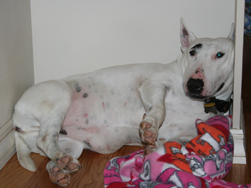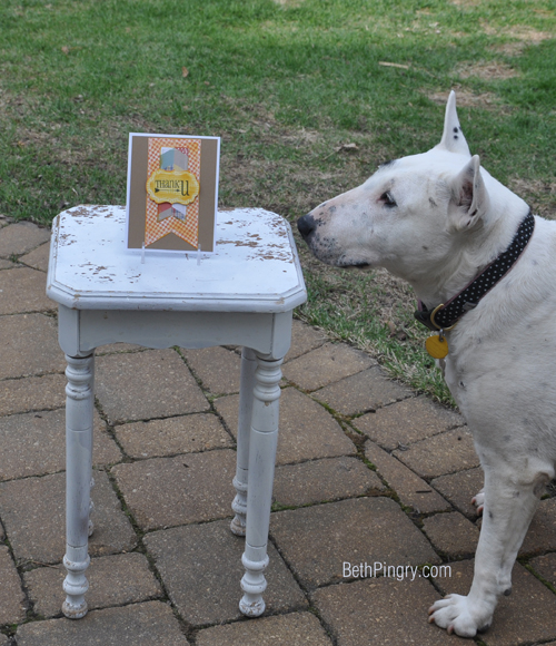 I decided to take the photos outside in natural light, and of course I can’t go outside alone… This is the little garage sale table I use for a lot of my photos. See how helpful Cindy is!