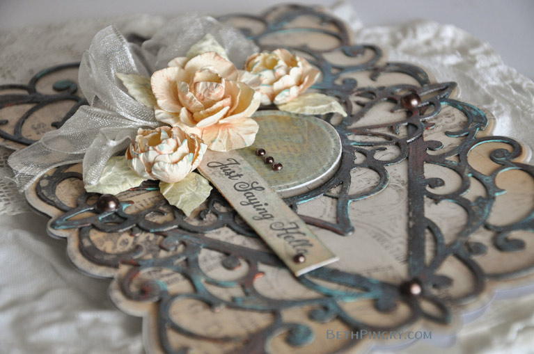 Close up of mixed media card using Bella Diamante die from Amazing Paper Grace and Spellbinders, by Beth Pingry.