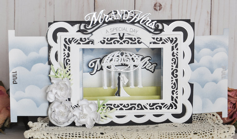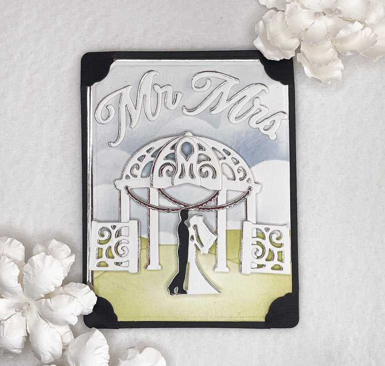 My card when closed, has a stenciled cloud on the front ‘doors’, and when you pull the sides to open the scene, the clouds continue along the sides and back. The bride and groom stand in front of a gazebo, with Mr and Mrs in script behind them. All the die cuts are layered in white a silver shadow. The groom is in black, which is just another layer that I trimmed to add more dimension to the scene.
