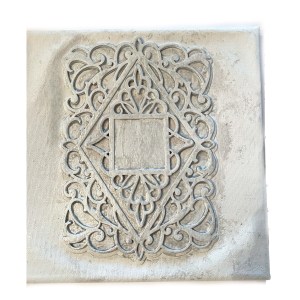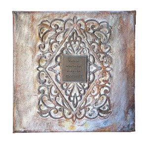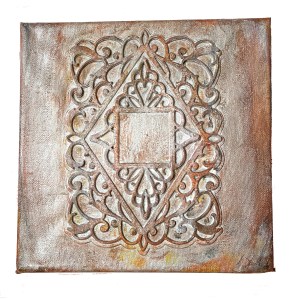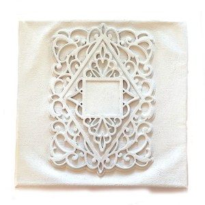 I started playing with the Bella Diamante die, cutting thin chipboard with it. I envisioned a wrought iron mixed media look with texture, rust, and dimension. I layered the chipboard die cuts and then added white paint, then silver, then a combination of rusty shades, along with crackle and iridescent medium.