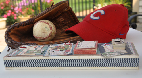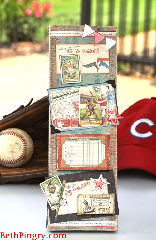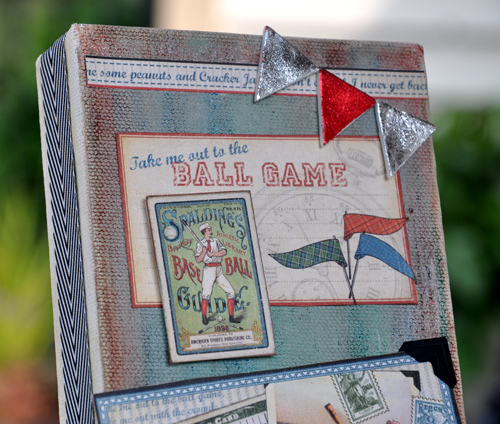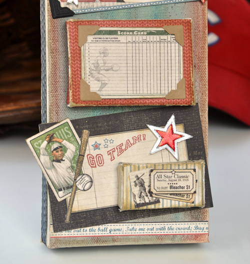 In this section I used mini canvases for additional dimension. I added kraft Creative Photo Corners to the score card. I wrapped the mini canvases with paper and Crafty Power Tape, sanded and inked the seams. The little bleacher tickets are layered with Crafty Foam Tape.