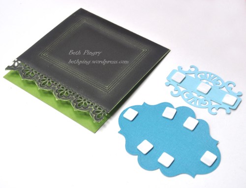 I took a piece of Core’dinations Black Magic Cardstock and cut the front edge with a Spellbinders Edgeabilities® Classic Petal Edger die and one of the Decorative Inserts from the same set.  At the same time, I cut the Fancy Tags Three  and Labels Twenty dies.  In the embossing step I added a Classic Rectangles LG die to just emboss the frame onto the front of the card, and the rest of the dies embossed in that pass as well.
