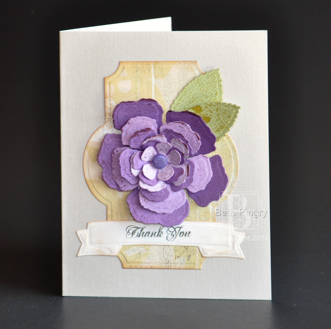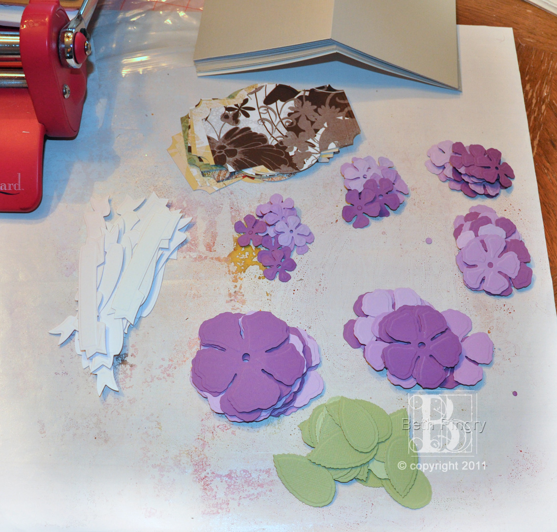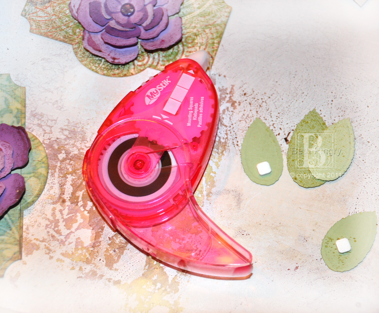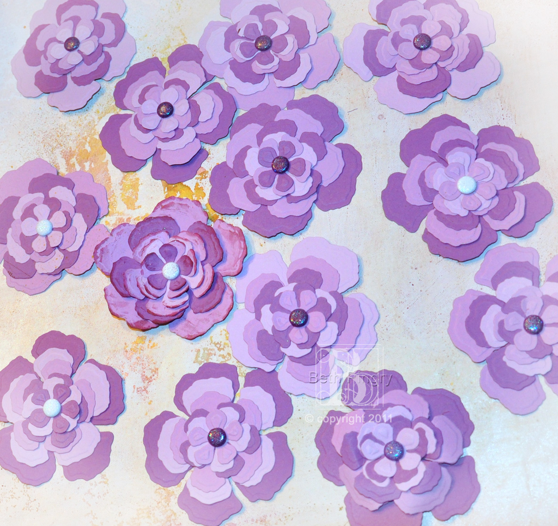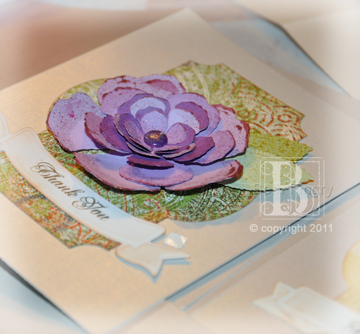 Next step, assemble the roses. I mixed and matched the purples and used sparkly brads from Creative Impressions. The leaves, labels and banners were edged with an ink pad. The leaves were also spritzed with Glimmer Mist.