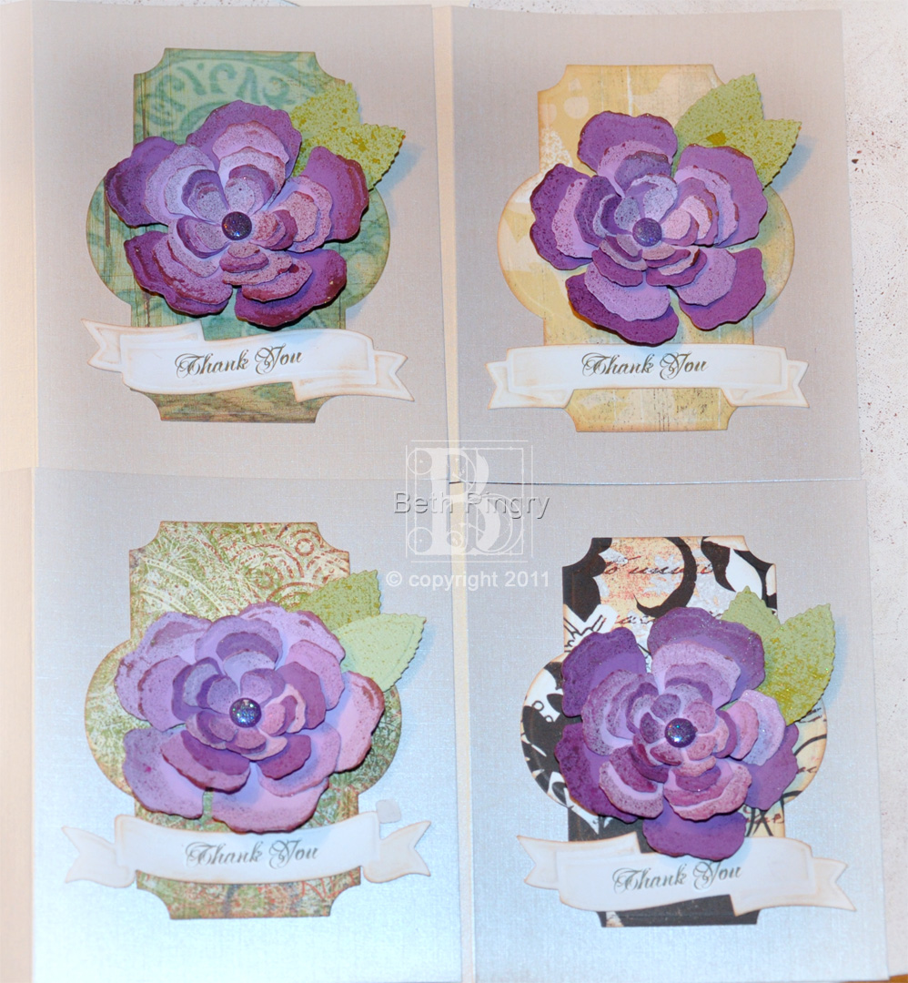 I’m way behind on sending thank you cards. My excuse is that I refuse to buy them in a store, and even if I do, I get the “where’s my hand made card?” response. I took some Saturday time to make cards, which are still sitting here because now I need stamps. Anyway, using the Grand Calibur™ and new Spellbinders™ die templates I whipped out a bunch bouquet of cards assembly line style.