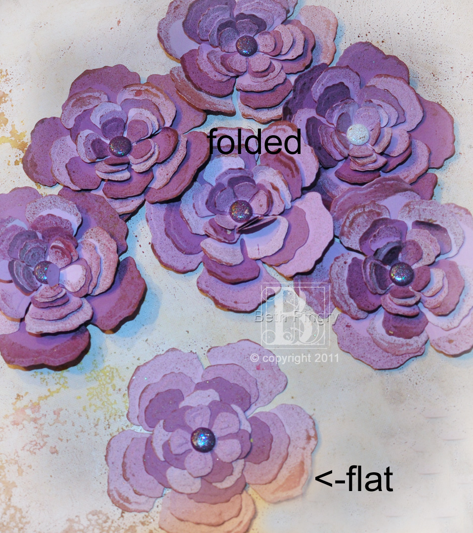 The flat flowers were not working for me. I folded the petals up and in to give the flowers some dimension. Then I sprayed some purple Glimmer Mist onto my mat and tapped and dragged the edges of the flower. This is quick and there is no reason to fuss about perfection in this step.