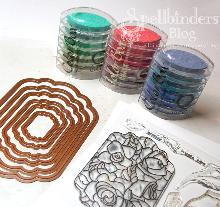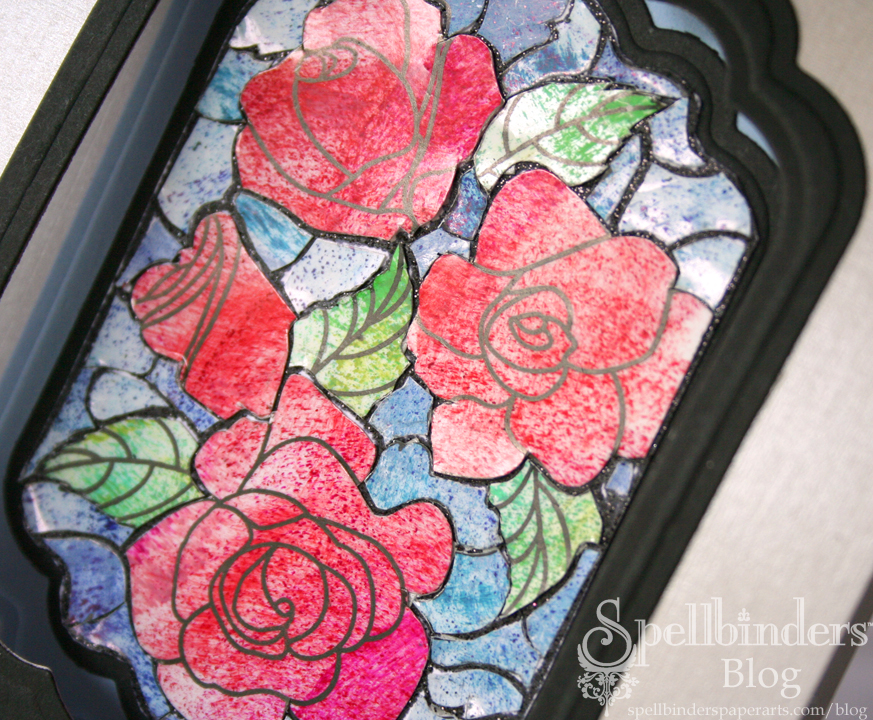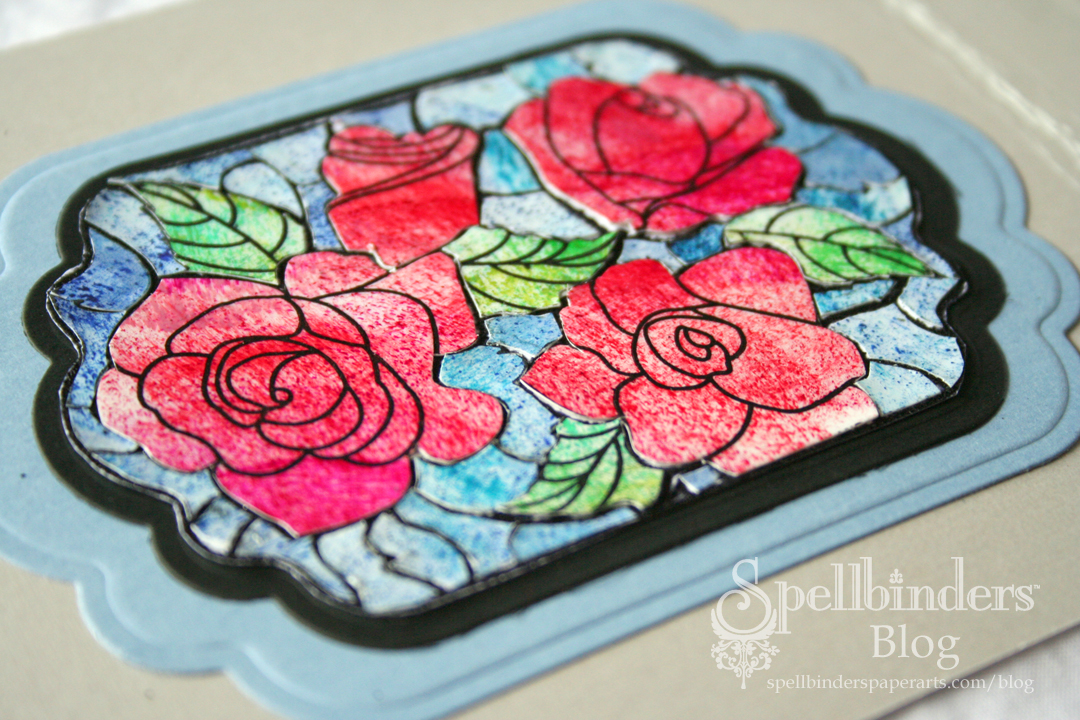 I teased about another idea with the Flourishes stamp set, and here it is. I don’t think of myself as a stamper so much as a paper crafter, so my brain goes beyond the stamp and color it in phase. I went in the ‘what kind of color would mimic stained glass’ and took it from there. I posted the full instructions on the Spellbinders™ Blog.