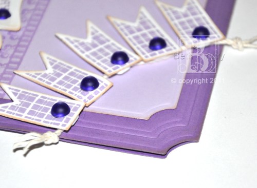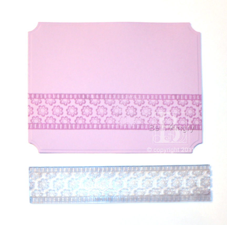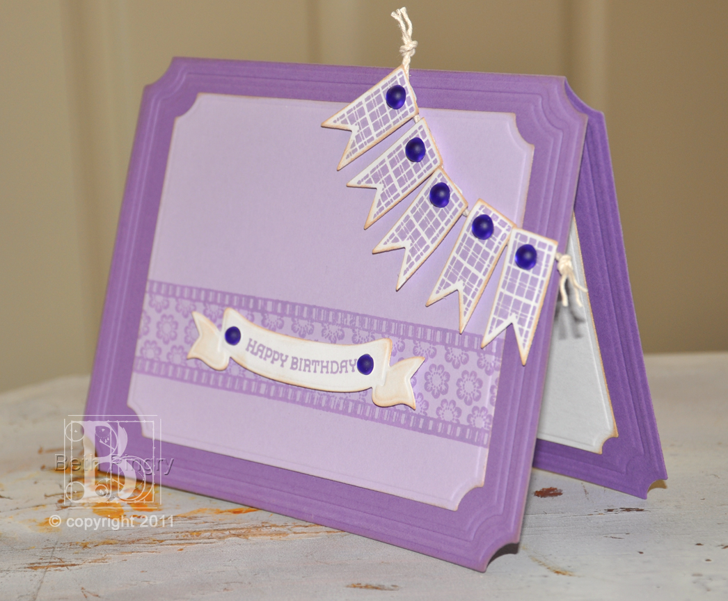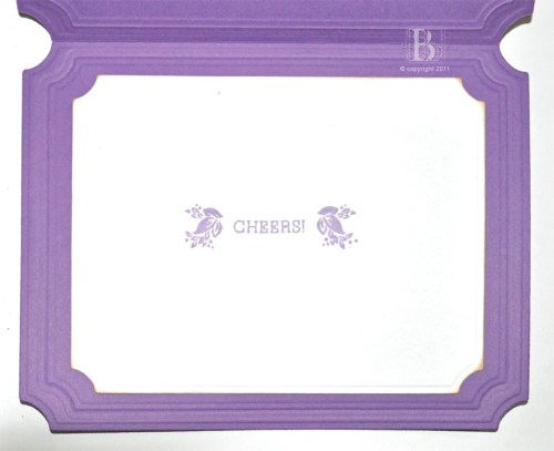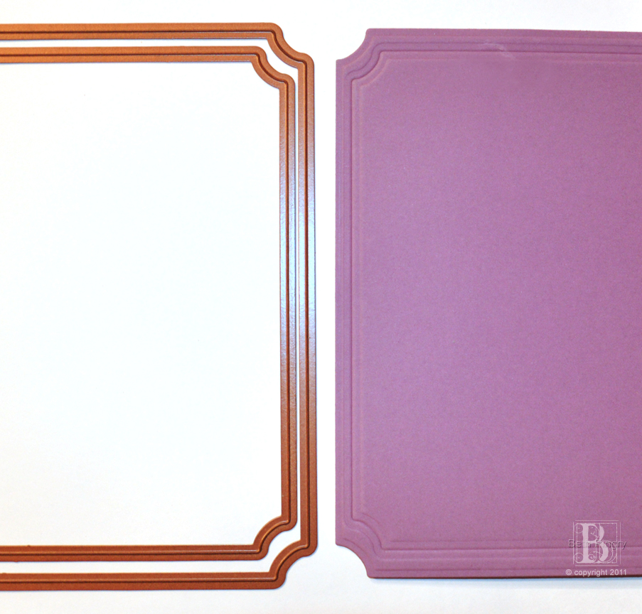 I cut/embossed with the #3 die template with white and lighter purple paper for the front and side of the card.  On the light purple front I stamped with one of the border stamps.
