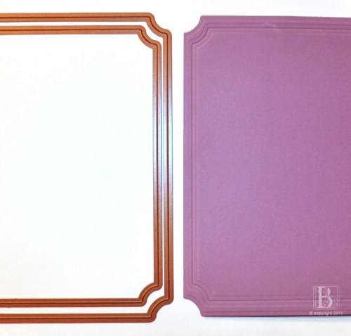 Next I taped the Grand Large Labels #4 to the card base, nesting it inside of the #5 die template.  I embossed this in the Grand Calibur™, and that’s how I achieved the second embossed line around the edges.